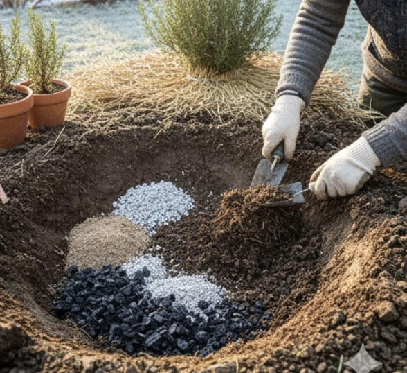 冬の対策として防寒アイテムを準備するよりも前に、まず土壌の排水性を徹底的に改善し、根鉢の水分量を減らしておくことが、根を凍結から守るための最も重要な第一歩になります。水分が少ない土は凍りにくいため、寒冷地では特にこの対策が欠かせません。