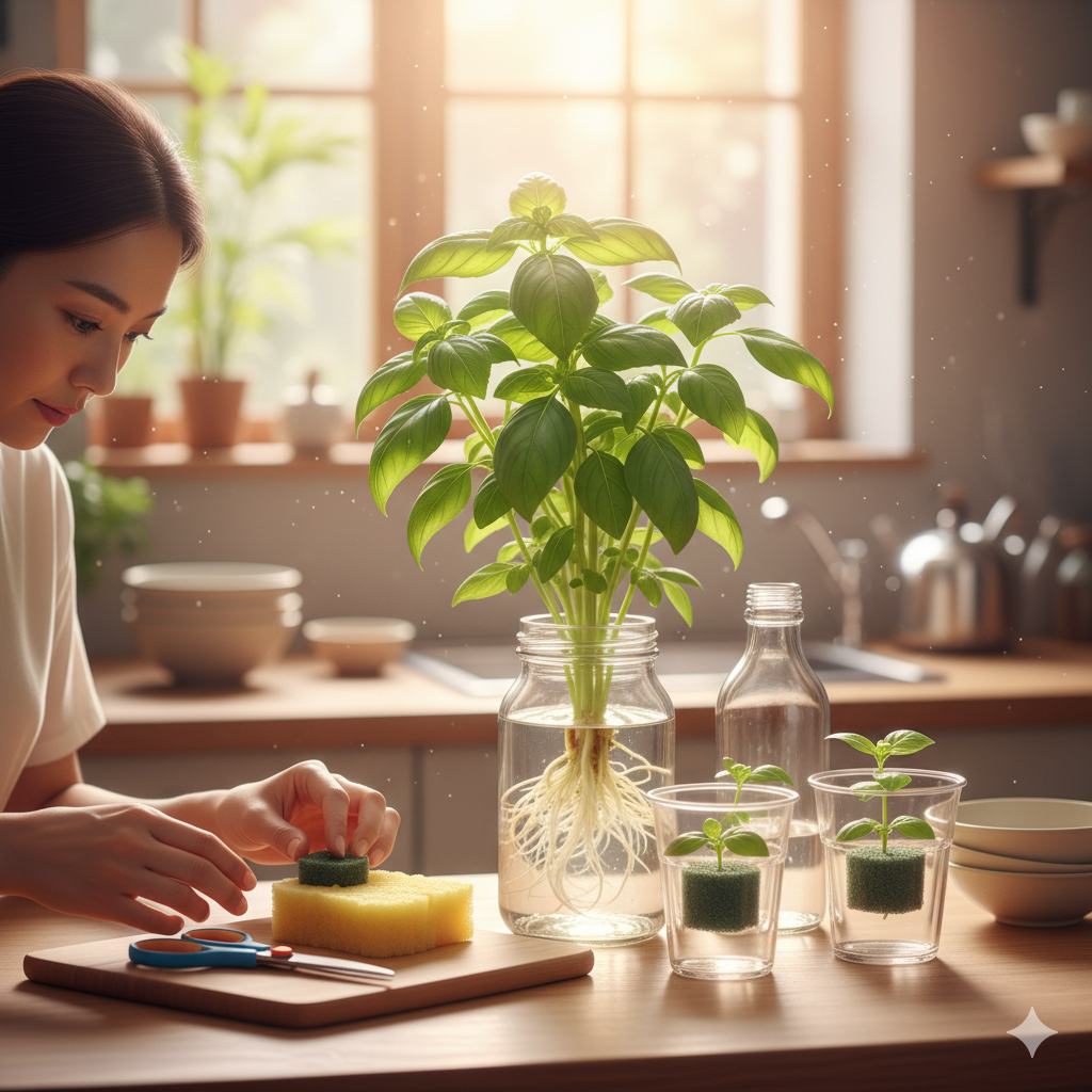 まず、皿洗い用のスポンジを消しゴムくらいの大きさに切り、真ん中にカッターで十字の切り込みを入れます。この切り込みの中にバジルのタネを一つずつ入れ、水をためたコップに入れて発芽させましょう。スポンジを深く切りすぎると日光が当たりにくくなるため、注意が必要です。発芽後は、ペットボトルやガラス瓶などの大きめの容器に移し替え、根が水に触れるように管理します。インテリアにこだわるのであれば、透明なガラス瓶を使うとおしゃれに楽しめます。